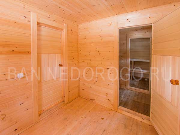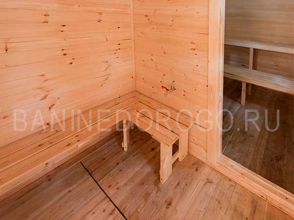 Отделка выполнена из сосны, как пол, так и стены. В скором времени это приведёт к замене материалов отделки по причине гниения.